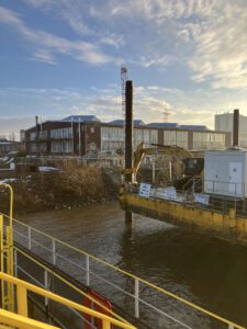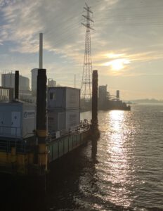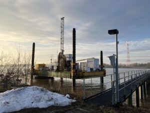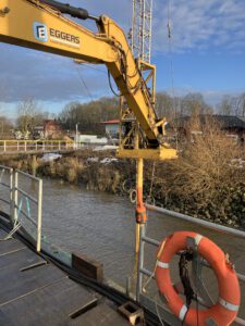 Für die spätere Durchführung der Hochwasserschutzmaßnahme am Bernhardtring in Bremen-Nord ist eine Kampfmittelsondierung innerhalb der Weser in Böschungsnähe erforderlich. Die Arbeiten erfolgen zur Zeit von einem Ponton mit Hilfe geeigneter Bohr- und Sondiergeräte.